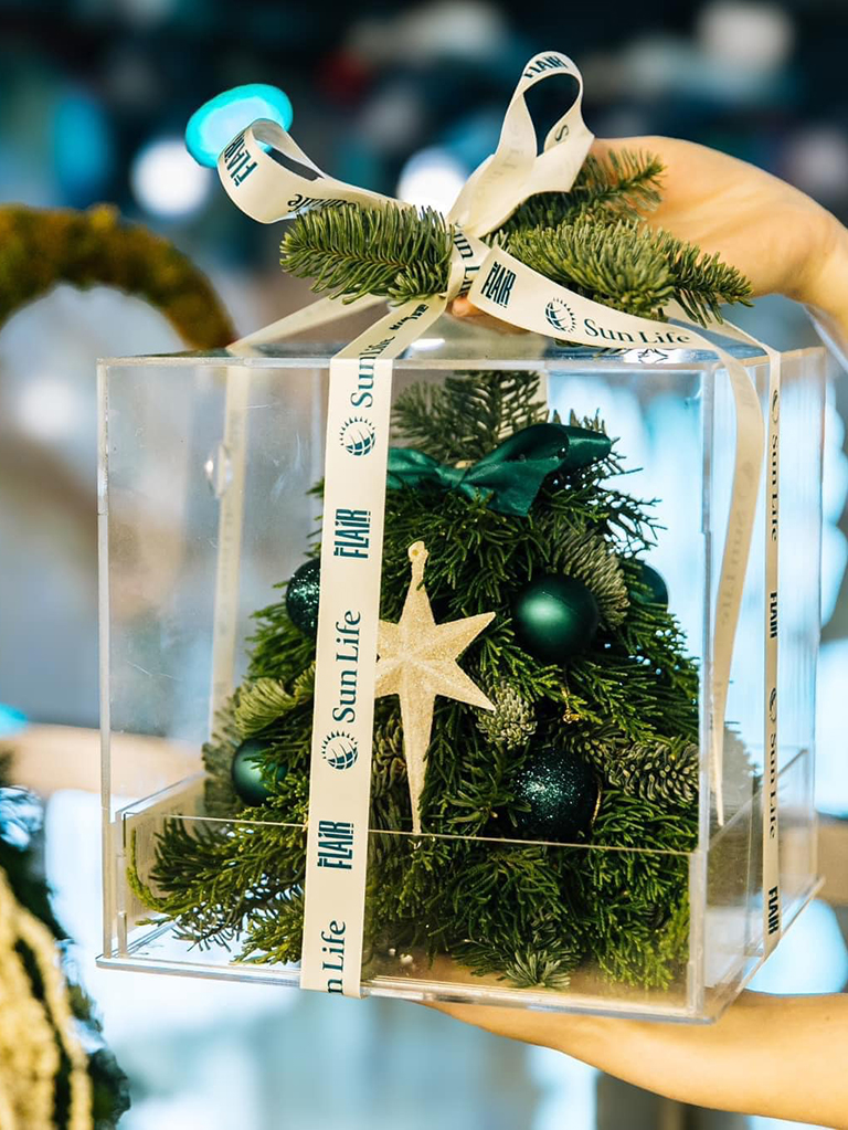 Mở đầu chương trình, khách hàng cùng người thân đến S.pace của Sun Life Việt Nam – lúc này từ văn phòng đã biến thành một không gian trải nghiệm – và làm những sản phẩm handmade bao gồm: bánh khúc cây, trang trí nhà gỗ giáng sinh và trang trí cây thông tươi. Thành phẩm sẽ được FLAIR BY SUN LIFE trau chuốt đóng gói và gửi quý vị mang về nhà.