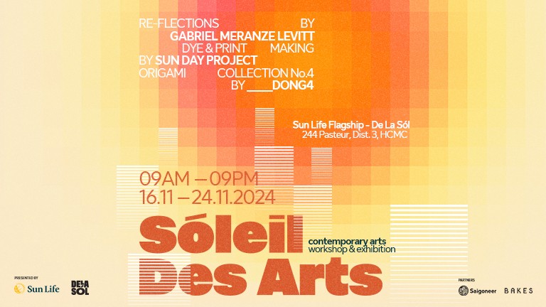 Tháng 11 này, Sun Life Việt Nam và De La Sól mang đến một sự kiện văn hoá kết hợp giữa triển lãm và không gian trải nghiệm workshop nghệ thuật mới mẻ, mang tên Sóleil Des Arts. Đây sẽ là nơi nghệ thuật được nuôi dưỡng qua đôi tay và khối óc của người nghệ sĩ, từ tác phẩm gương độc đáo của nghệ sĩ Gabriel Meranze Levitt, những bản in đa chất liệu tại xưởng nhỏ của nhóm Sunday Project đến các thực hành nghệ thuật Origami mới lạ của nghệ nhân Tạ Trung Đông.